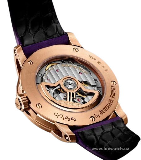 77410OR.OO.A623CR.01 Audemars Piguet  This watch comes in a 38 mm 18K Rose Gold case. Fixed 18K Rose Gold bezel. Prune coloured inner bezel with minute scale. The prune coloured guilloché dial. Rose gold-tone skeleton hour hands with luminous coating. Rose gold-tone hour markers. Central second hand. The date window is located at the 3 o'clock position. The watch performs following functions: hours, minutes, seconds, date. Self-winding mechanical movement is powered by a Сalibre 5900. Power reserve approximately 60 hours. Case Thickness - 9.6 mm. Case back is transparent. Sapphire crystal protects front and back side of the watch. Prune coloured alligator leather strap with pin clasp. This model is water-resistant up to 30 m.