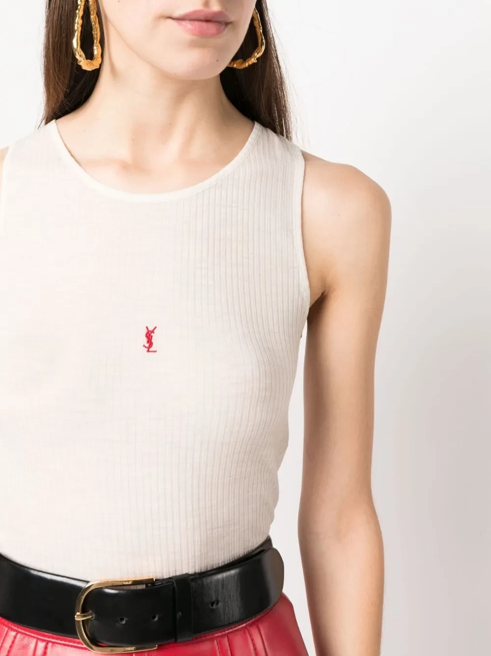 Saint Laurent puts an elevated twist on the classic tank top. Spun from wool to a flexible ribbed-knit, it’s embroidered with contrasting red YSL initials front and centre.