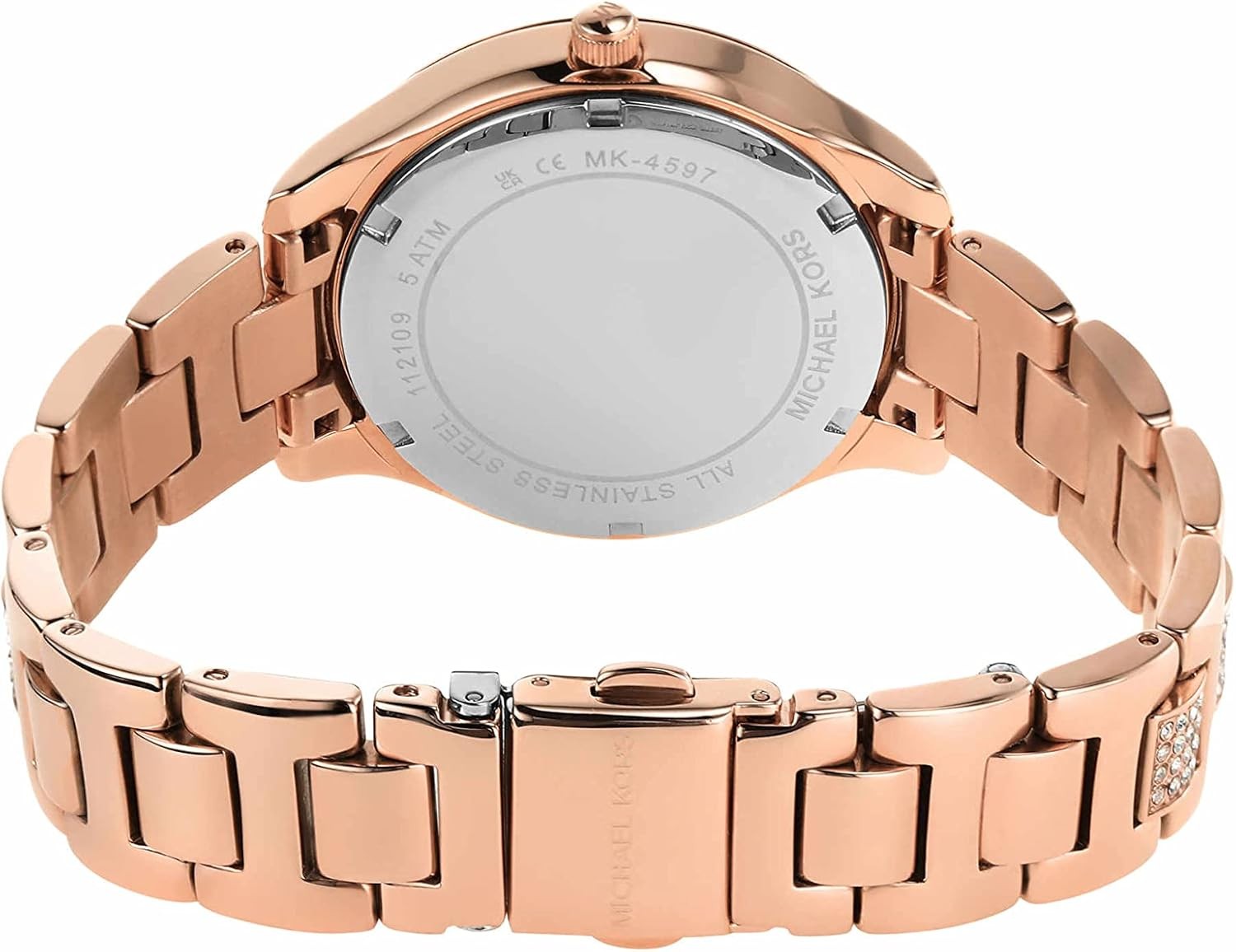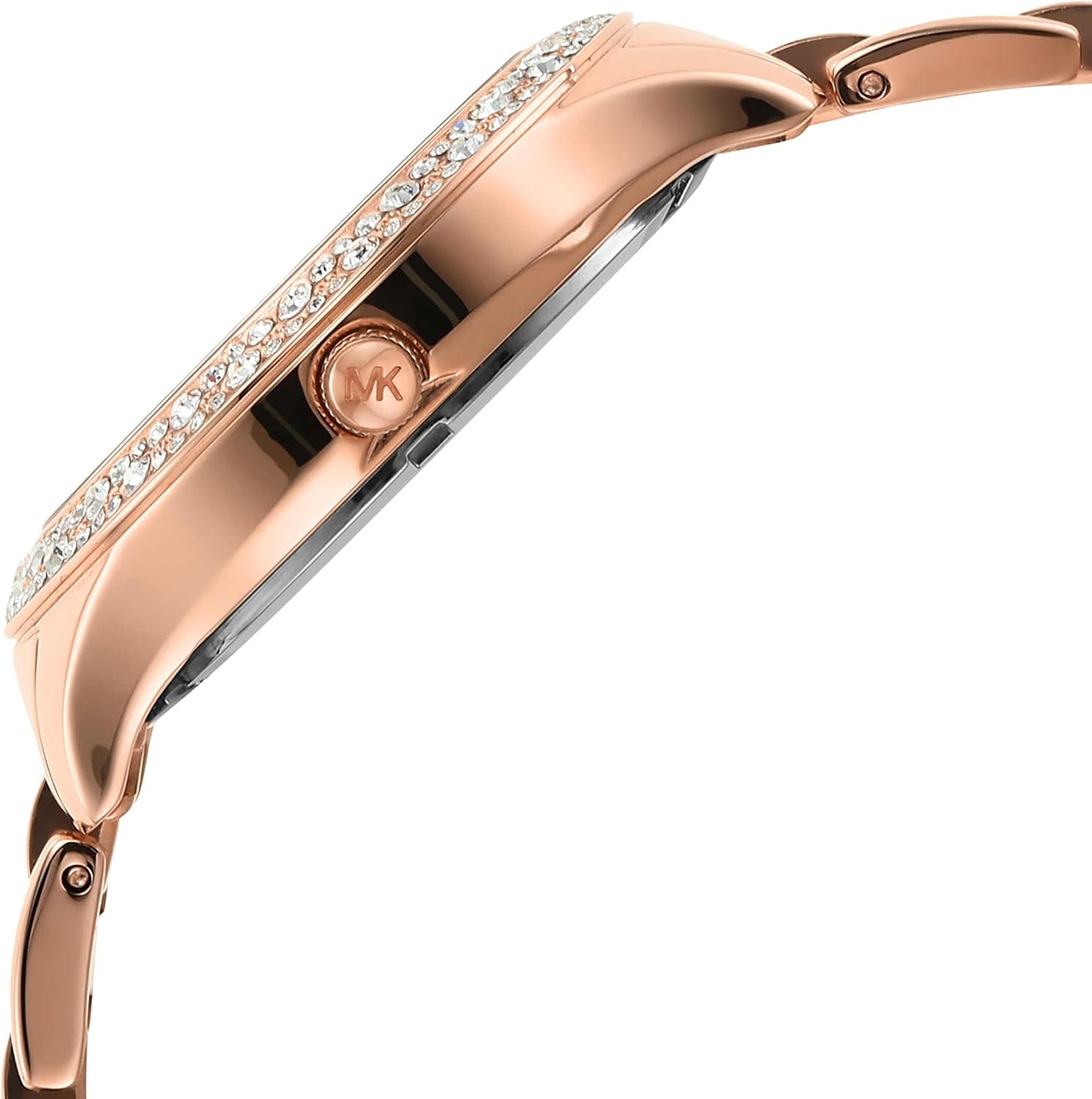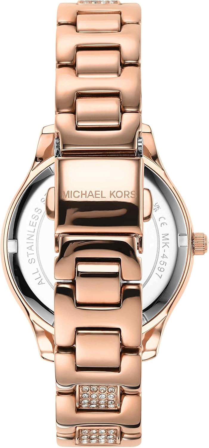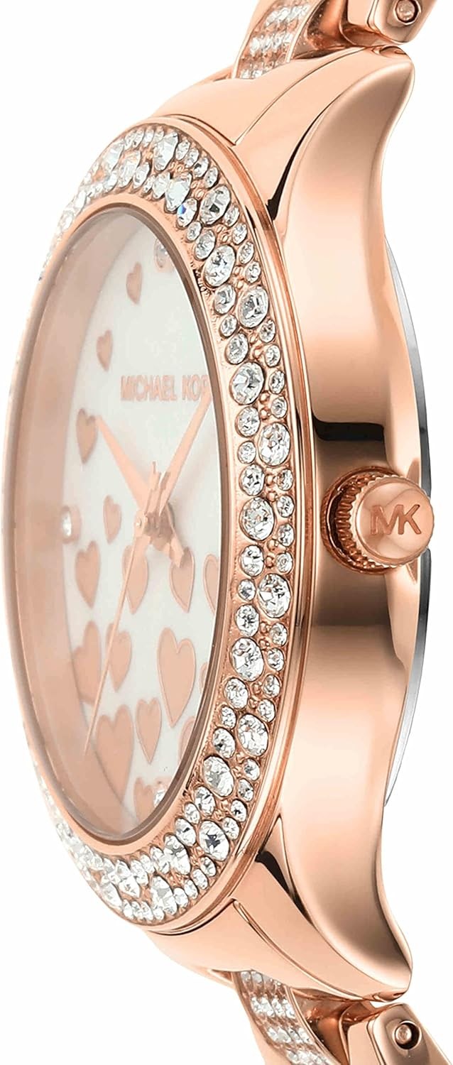 Made in the USA or Imported Michael Kors is a world-renowned, awardwinning designer of luxury accessories and ready-to-wear. His namesake company, established in 1981, offers glamorous, sophisticated style for the consummate jetsetter. Michael Kors' 36mm Liliane watch features a white novelty Mother of Pearl Dial with heart details and glitz indexes, rose gold-tone case with a stingray pavé topring, three-hand movement and rose gold-tone stainless steel bracelet with pave center links. 36mm case, 16mm band width, mineral crystal, Quartz movement with 3-hand analog display, imported. Water resistant up to 50m: Wearable while swimming in shallow water.