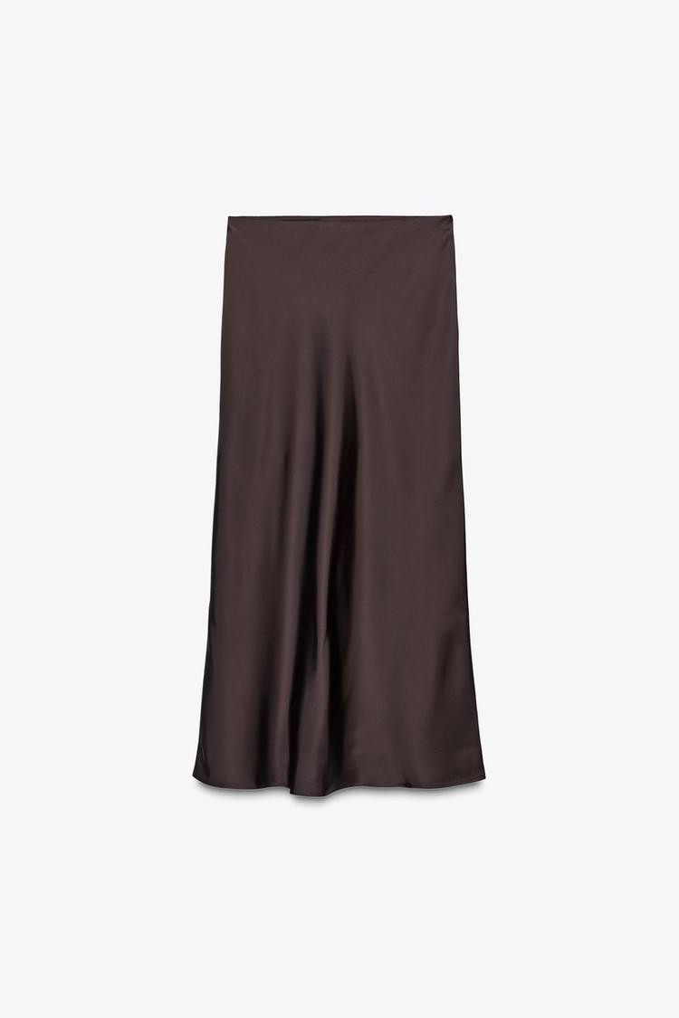 A sleek and elegant skirt in a lustrous satin material, featuring a side slit and a delicate slip-dress-inspired silhouette.